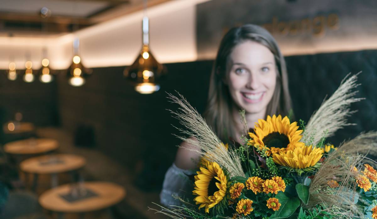 • Eine junge Dame im Launchraum des Hotels mit einem herbstlichen Blumenstrauß in der Hand