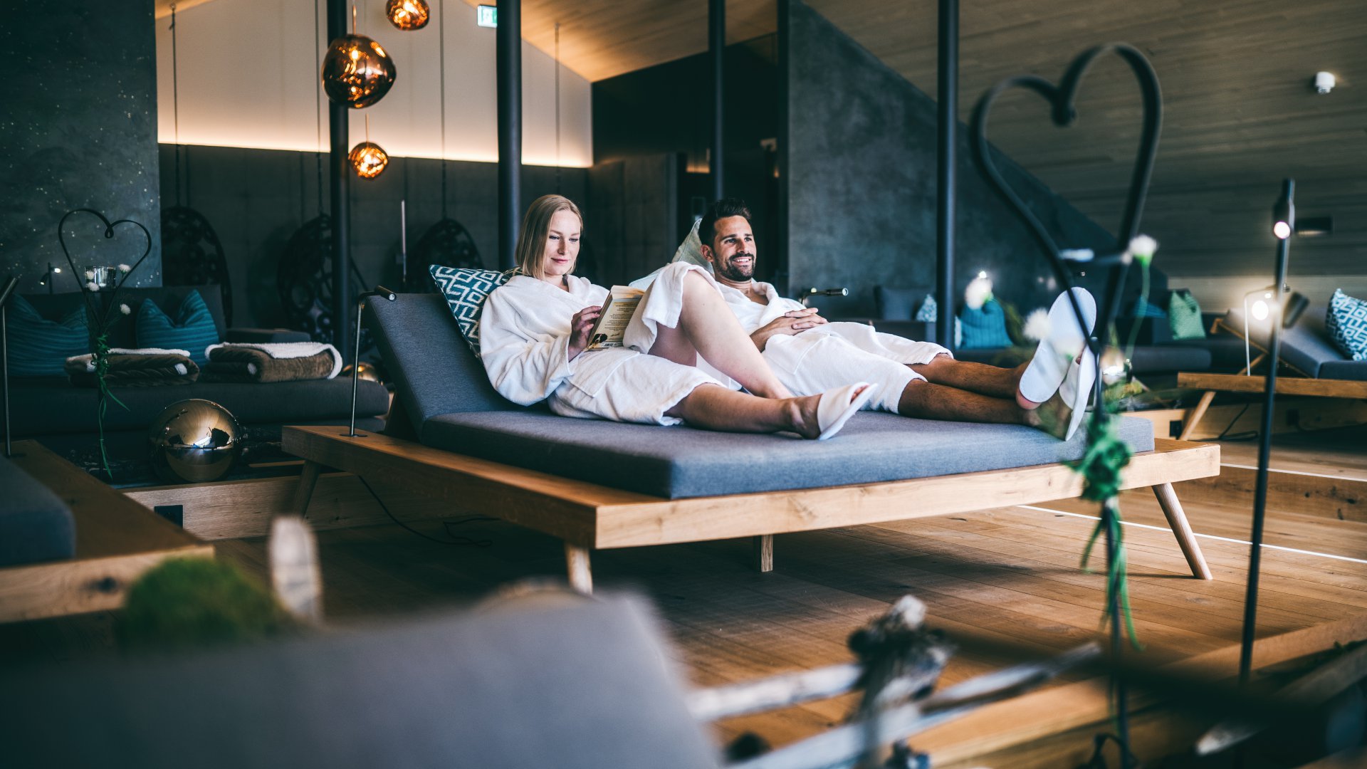 - Ruheräume – Panoramaruheraum mit Bergblick, Infrarotraum, Soleinhalationsruheraum, Ruhen bei offenem Kamin mit Kuschelkojen und Schwebeliegen, Ruheraum mit beheizten Wasserbetten und Steinliegen
