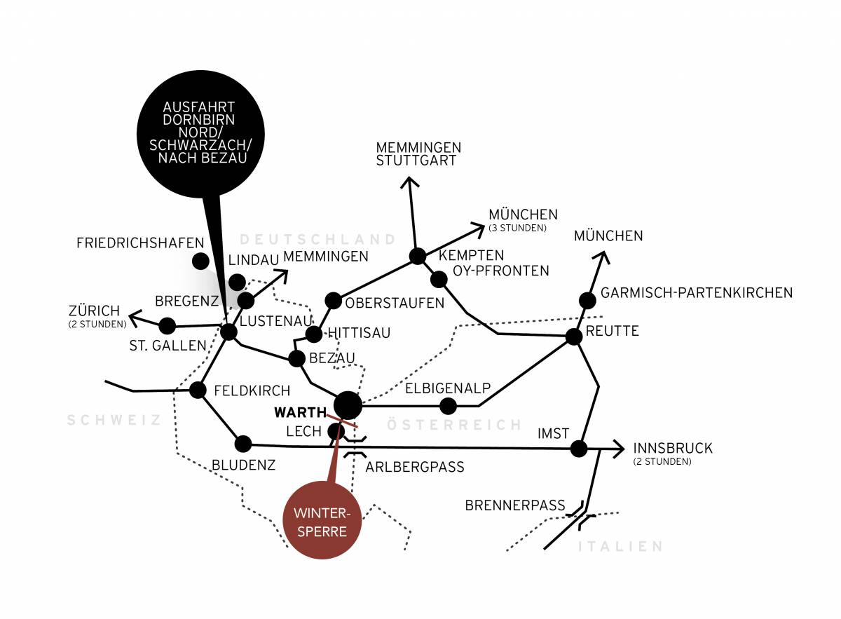 - From Switzerland: St. Gallen – Exit at Au/Lustenau – Dornbirn – Bezau - Schoppernau – Schröcken – Warth