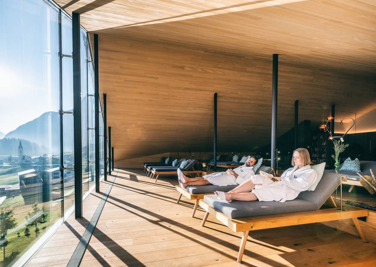 Please your senses with a view of the 2,599 m high summit of the large Biberkopf mountain. Look into the sky above the Arlberg while you take in the fragrance of freedom and relaxation. - Panorama relaxation room Relax with a view. Inner tranquility with a breathtaking view. You will find a small library here.