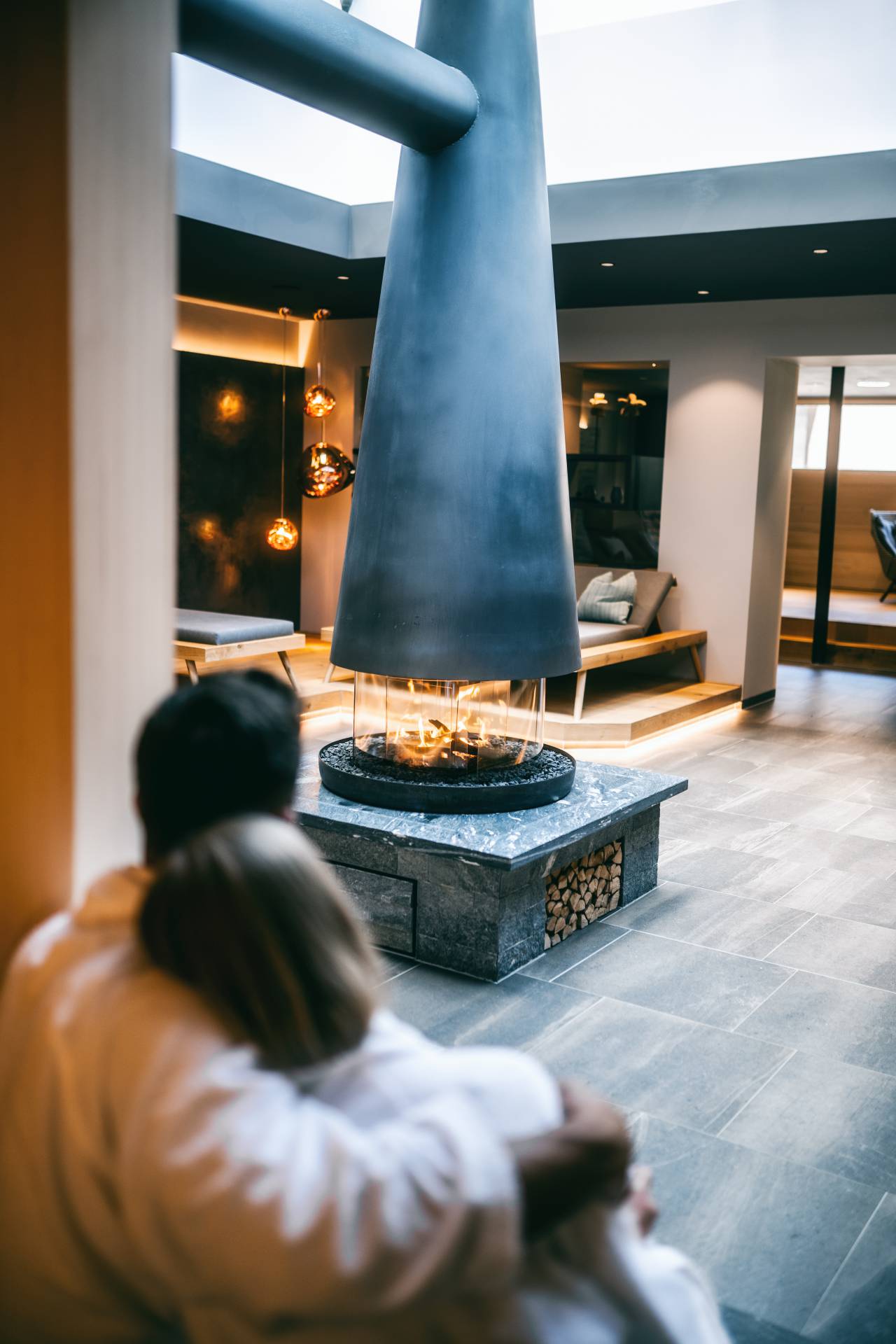- Relaxation room with an open fireplace with cuddle corners and floating lounges